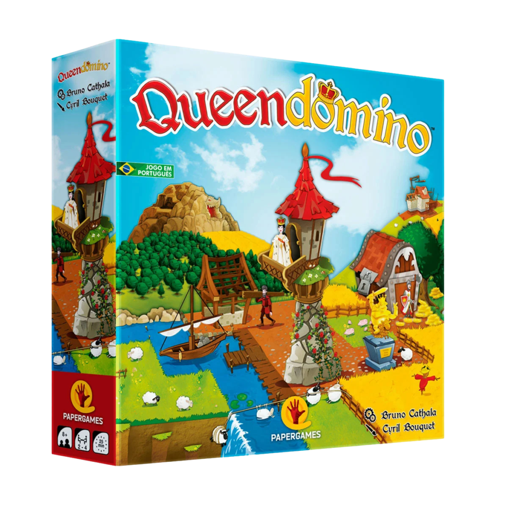 Em Queendomino, construa o reino de maior prestígio, conquistando campos de trigo, florestas, lagos, pastagens, montanhas e vilas. Seus cavaleiros lhe trarão riquezas na forma de moedas. Desenvolva as vilas em suas terras, construindo estabelecimentos que lhe darão oportunidades para novas estratégias. Você pode conquistar o coração da Rainha, mas tenha cuidado com o Dragão! Queendomino é um jogo novo e completamente independente do premiado Kingdomino* e oferece uma variedade de desafios mais complexos. Você pode combinar o Queendomino com o Kingdomino* e utilizar as variantes “Casamento Real”, que incluem novas formas de jogar em grupos ou individualmente e permitem grupos de até 8 jogadores. Um jogo desafiador, para todas as idades, do premiado autor Bruno Cathala, com belíssimas ilustrações de Cyril Bouquet.